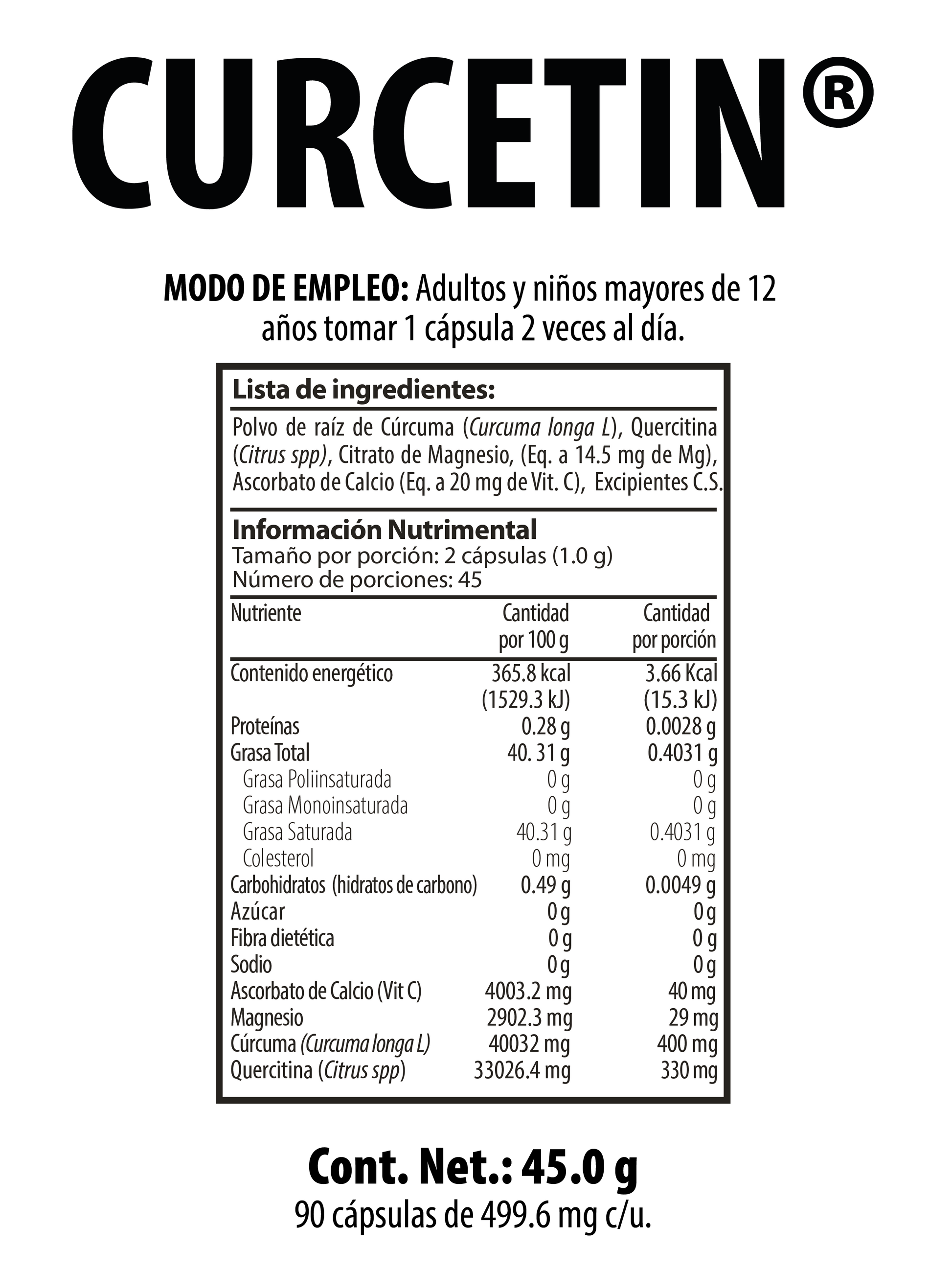 Formula with Curcuma longa, Quercetin, Vitamin C, and Magnesium. Its purpose is to complement total dietary intake.