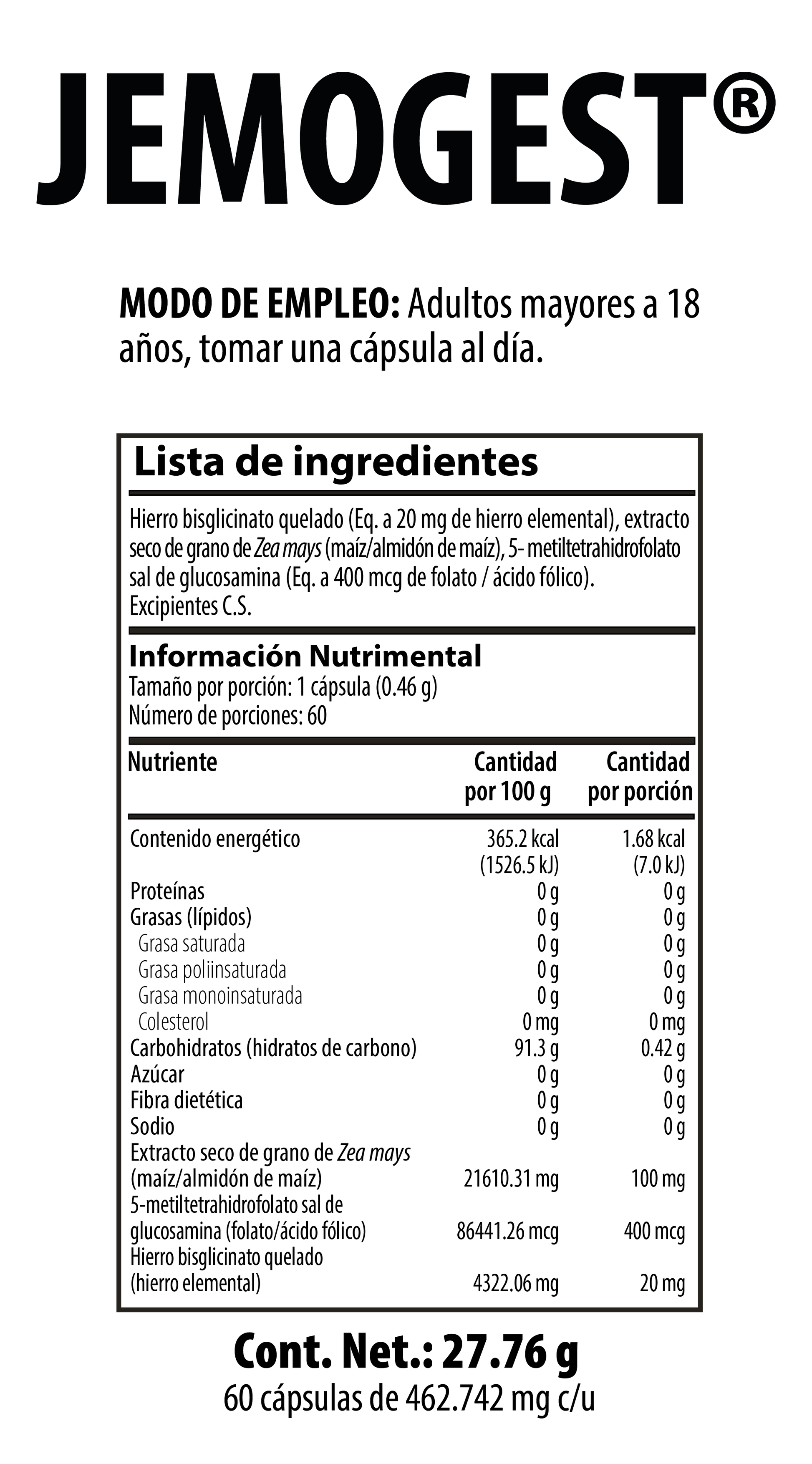 Formula with Chelated Iron Bisglycinate and 5-Methyltetrahydrofolate Glucosamine Salt. Its purpose is to complement total dietary intake.