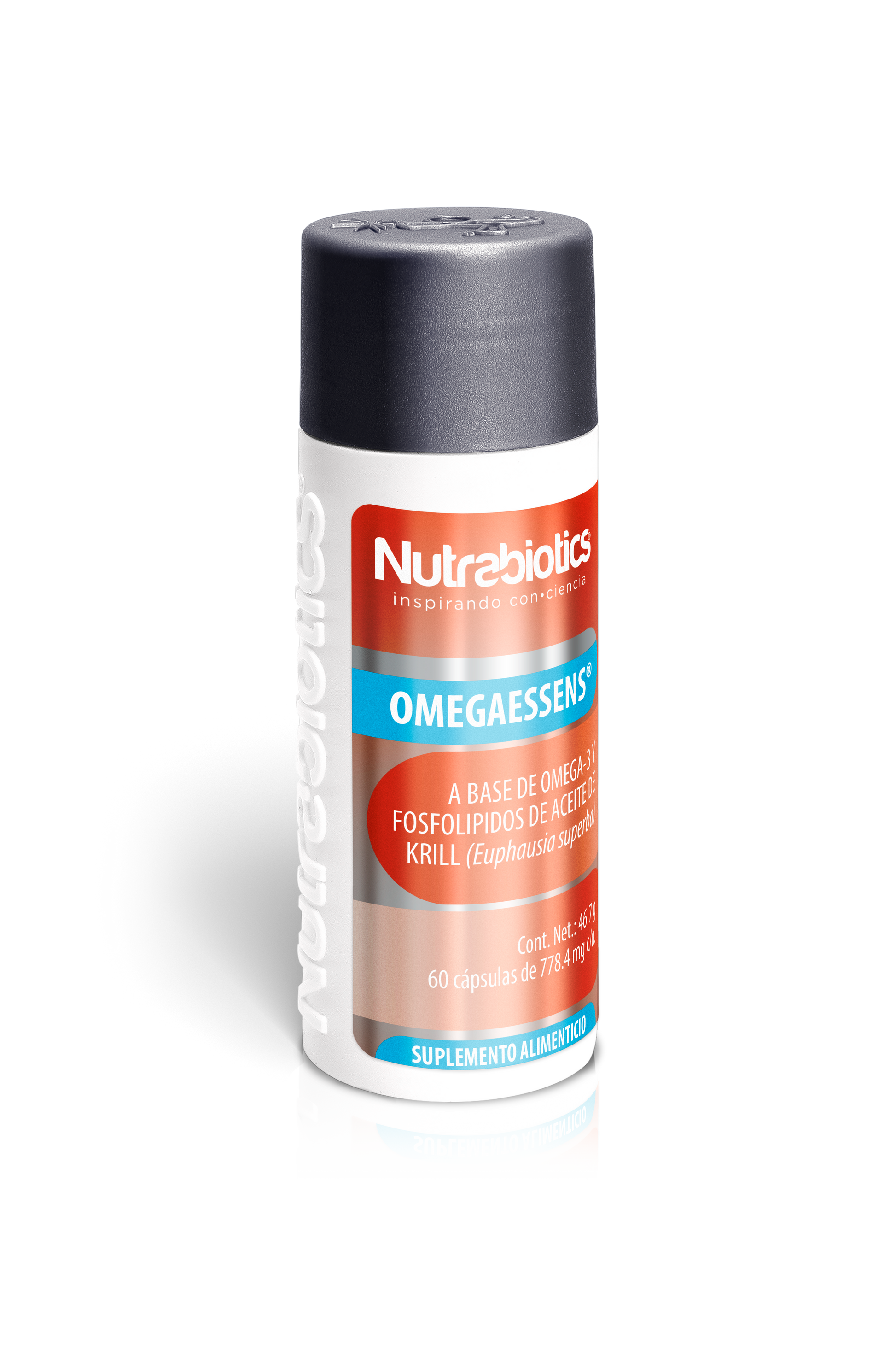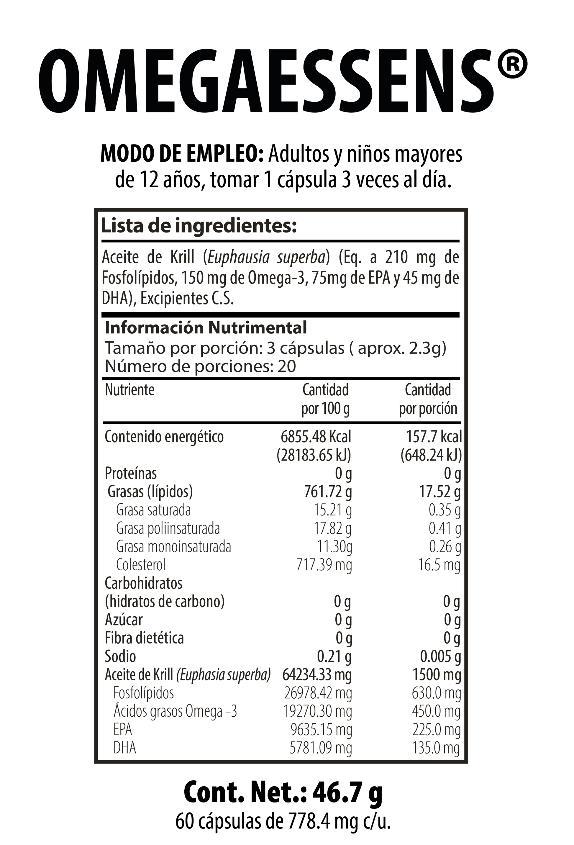 Formula with Omega 3 and Phospholipids from Krill Oil (Euphausia superba). Its purpose is to complement total dietary intake.
