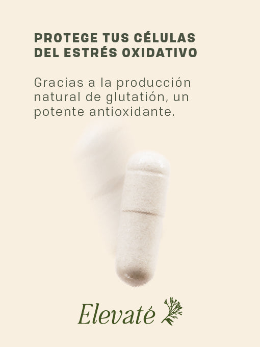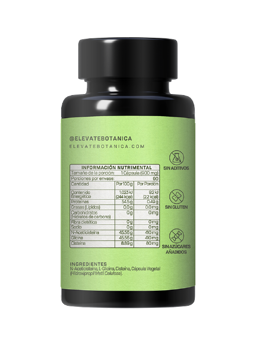 Glicina + NAC es una fórmula diseñada por Elevaté Botánica que actúa como precursor del glutatión. Cada cápsula contiene 900 mg y, además de glicina y NAC, está enriquecida con cisteína. Elevar los niveles de glutatión es importante para neutralizar los radicales libres y regenerar la salud celular. Ver el texto: Glutatión, el antioxidante maestro.